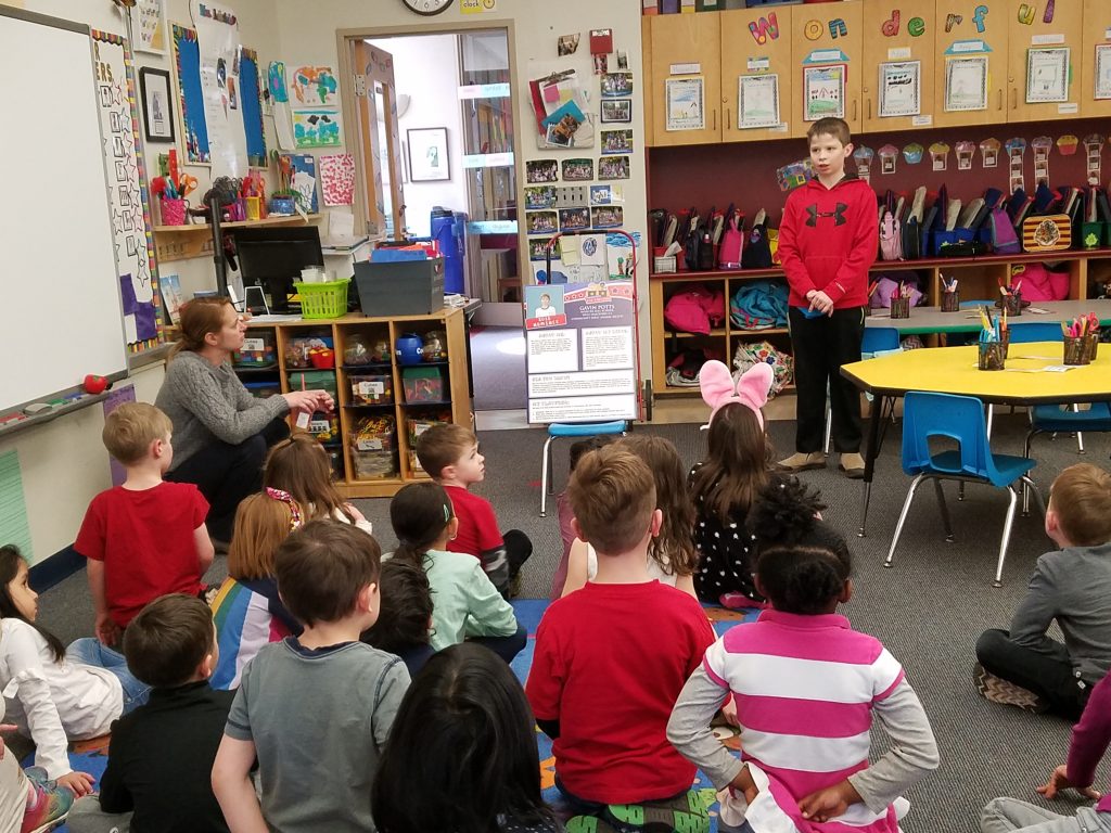Previous ImageNext Image Gavin- Kid Governor CTKG nominee Gavin talks about his exhibit panel to younger students at Webster Hill Elementary School.